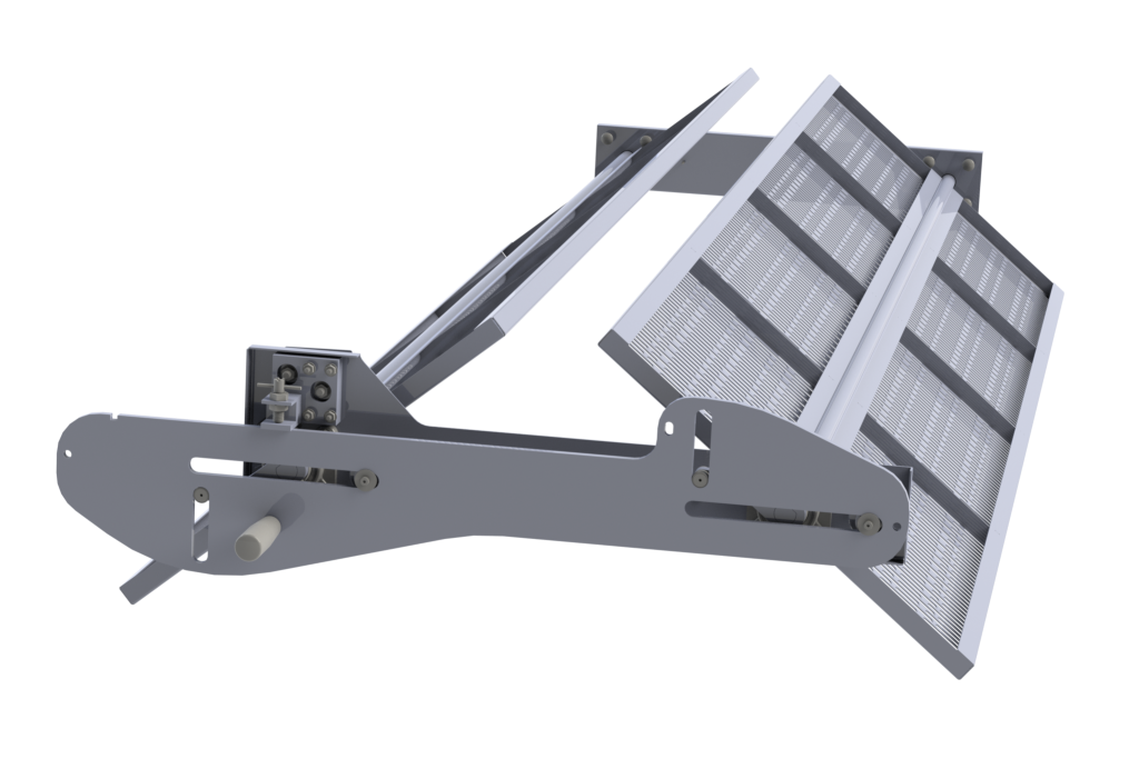 The stackable assemblies were required to support and convey wet biomass while simultaneously allowing sustained air flow through the assembly (to dry the material). As the biomass material is dried it is progressively conveyed to a lower level of the stacked assembly, thereby enabling additional “raw” biomass to be added at the top.